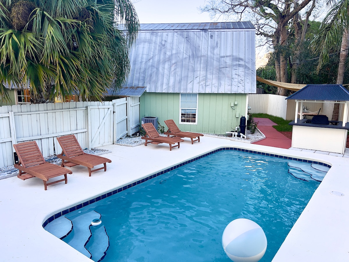 तुमच्या स्वतःच्या आधुनिक, खाजगी सुईटमध्ये विश्रांती घ्या आणि रिचार्ज करा - होस्ट्सच्या राहण्याच्या जागेपासून वेगळे. वर्षाच्या कोणत्याही वेळी ताजेतवाने होण्यासाठी तुमच्या प्रशस्त खाजगी पूलच्या बाहेर पडा. पूल गरम नाही - पण नेहमी उत्साहवर्धक! एक जोडपे किंवा सोलो रिट्रीटसाठी योग्य. गर्दीपासून दूर जाण्यासाठी आणि आराम करण्यासाठी एक शांत जागा. या बंद करा: वेरो बीच एयरपोर्ट (ब्रीझ, जेट ब्लू, अमेरिकन एअरलाइन्स) 7 मिनिटे जॅकी रॉबिन्सन प्रशिक्षण कॅम्प 6min डाऊनटाऊन वेरो 7 मिनिट वेरो बीच म्युझियम 14 मिनिट बीच 17 मिनिटे