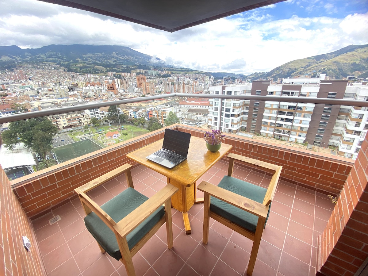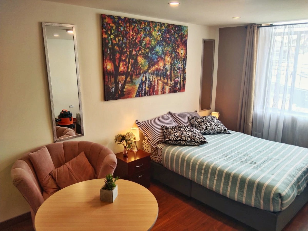 Studio apartment with a design inspired by the Galeras volcano. Located in the Centenario neighborhood, on the banks of the Pasto River, just one block from the Rosero Museum. A 15-minute walk to "Plaza del Carnaval" We have a plenty of books, and board games so you can connect with your roommates. The apartment is on the 12th floor of a building with an elevator. We've included a schedule of cultural activities in the city.