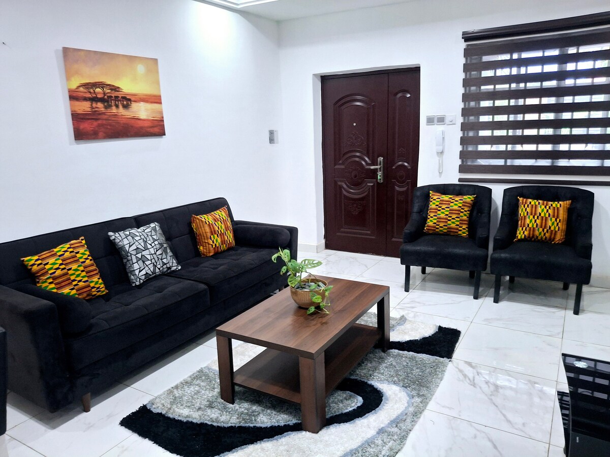 Refresh your soul in this vintage apartment, located at a strategic position connecting all the major road networks, making it easy to beat the rush hour traffic. It is about 30 mins drive from the city centre. Exclusively furnished, gated with a 24/7 personnel at post, best bet for peace and sefety. The SPAR Supermarket, Cash Point(ATM), Forex Bureau, Spa/Saloon, Pubs, Groceries and Eateries just 5 minutes' walking distance.The Accra beaches and tourist attractions are about 30 minutes' drive.