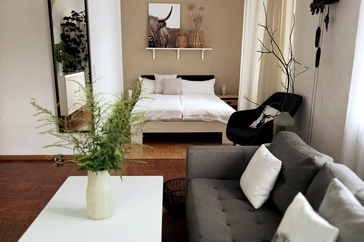 नुकतेच नूतनीकरण केलेले प्रशस्त अपार्टमेंट मध्यवर्ती ठिकाणी आहे आणि रेल्वे स्टेशनपासून 5 मिनिटांच्या अंतरावर आहे. ऑफनबर्ग शहर एक सुंदर पादचारी क्षेत्र आणि पाहण्यासारखे क्षेत्र ऑफर करते. ब्लॅक फॉरेस्ट, फ्रँबर्ग, Europapark किंवा Alsace च्या ट्रिप्स उपलब्ध आहेत. सार्वजनिक पार्किंगमधील निवासस्थानाजवळ पार्किंग उपलब्ध आहे (सोमवार ते शनिवार शुल्कासाठी सकाळी 9 ते सायंकाळी 7 पर्यंत). सायकली आणि मोटर्स सुरक्षितपणे सामावून घेतले जाऊ शकतात.