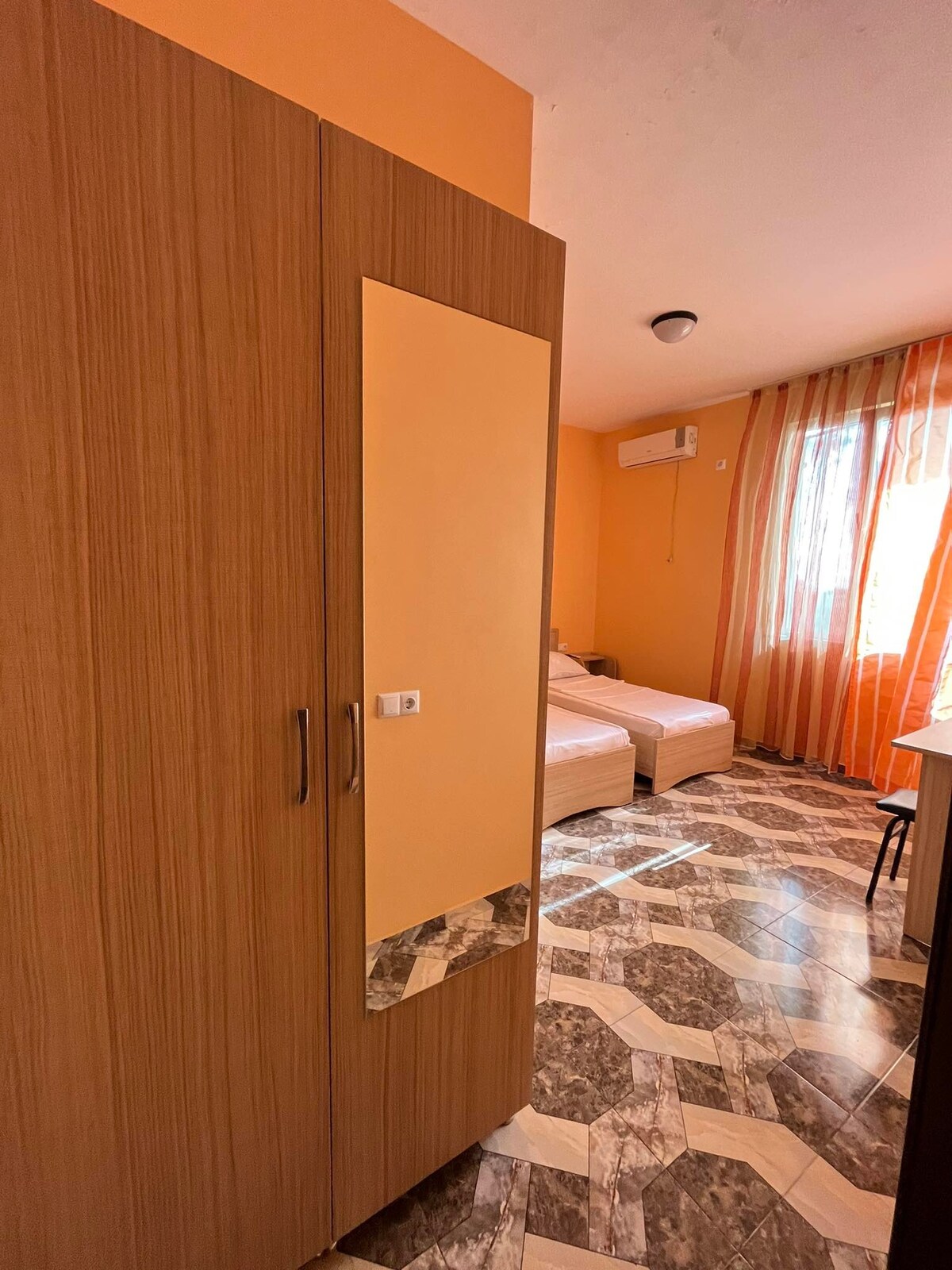 For this property one double bed, two single beds and if requested one baby bed is available. Option with all meals - additional $10 per adult per day (half price for kids below 7). Room is being just renovated. The place is 100m from the black magnetic sand beach, surrounded with pine trees. Safe, quiet, friendly environment, delicious and healthy food!