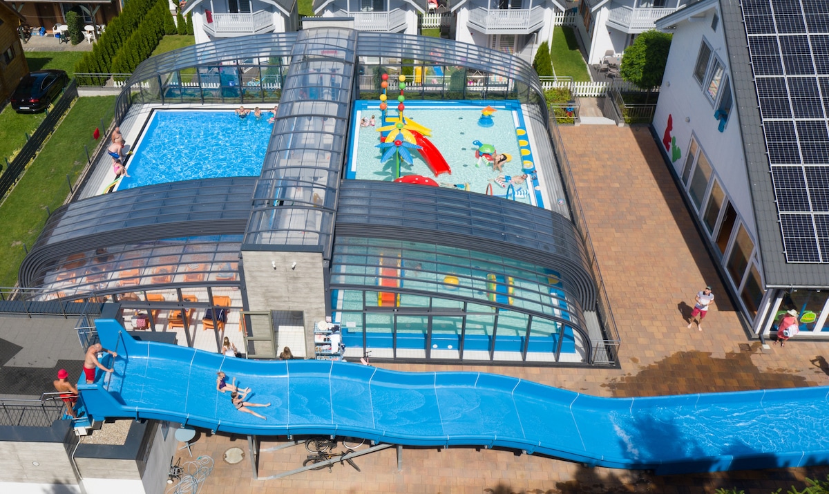 सूर्यप्रकाशाने भरलेला कोपरा हा स्ट्रझेवो गावामध्ये स्थित एक रिसॉर्ट आहे, तिथे 5 आरामदायक कॉटेजेस, एक खेळाचे मैदान, एक ग्रिल आणि गरम पाण्याने भरलेला एक मोठा पूल आणि एक रशियन गठ्ठे,सायकली,पिंग - पोंग, ट्रॅम्पोलिन, फुटबॉल फील्ड आहे. कॉटेजेस समुद्रापासून 3000 मीटरपेक्षा कमी अंतरावर आहेत, जिथे एक सुरक्षित मार्ग आहे. आमची कॉटेजेस उच्च दर्जाची आहेत, ती आरामदायक आहेत. आम्ही सर्व गेस्ट्सना रिसॉर्टमध्ये पार्किंगच्या जागा देतो. संपूर्ण लाउंज कॉम्प्लेक्सला कुंपण आहे.