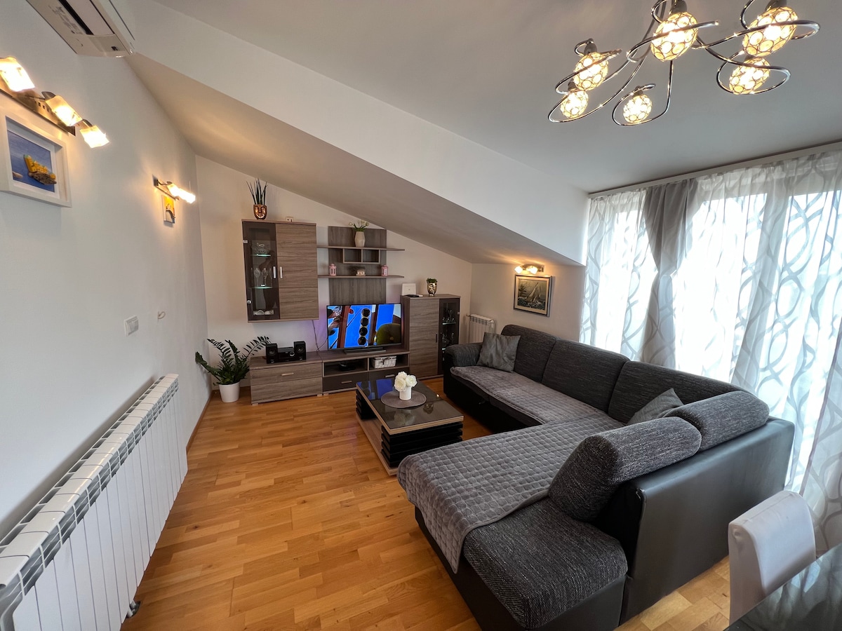 हे आधुनिक आणि आरामदायक अपार्टमेंट आहे ज्यात एक बेडरूम आहे ज्यात मोठी लिव्हिंग रूम आणि दोन बाथरूम्स आहेत. आराम आणि डिनरसाठी सुंदर बाल्कनी आदर्श आहे. हे नवीन आणि आधुनिक घरात स्थित आहे, शहराच्या मध्यभागीपासून 10 -15 मिनिटांच्या अंतरावर आहे.