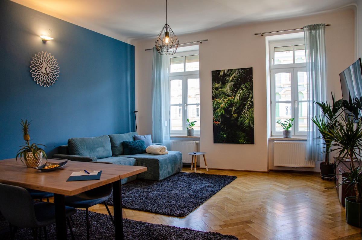 2 बाल्कनी असलेले 80m2 अपार्टमेंट ग्रॅझच्या मध्यभागी आणि लेंडप्लाट्झ आणि सर्व ट्रामच्या आसपास आहे. हे सुसज्ज आहे जेणेकरून तुम्ही तुमच्या वास्तव्याचा खरोखर आनंद घेऊ शकाल. बेडरूममध्ये, किंग साईझ + बेड आणि पाम पेंटिंग तुम्हाला एक अद्भुत झोपेची हमी देते आणि किल्ल्याच्या पर्वतांकडे दुर्लक्ष करते, तो दिवस विशेषतः चांगला वाटतो.