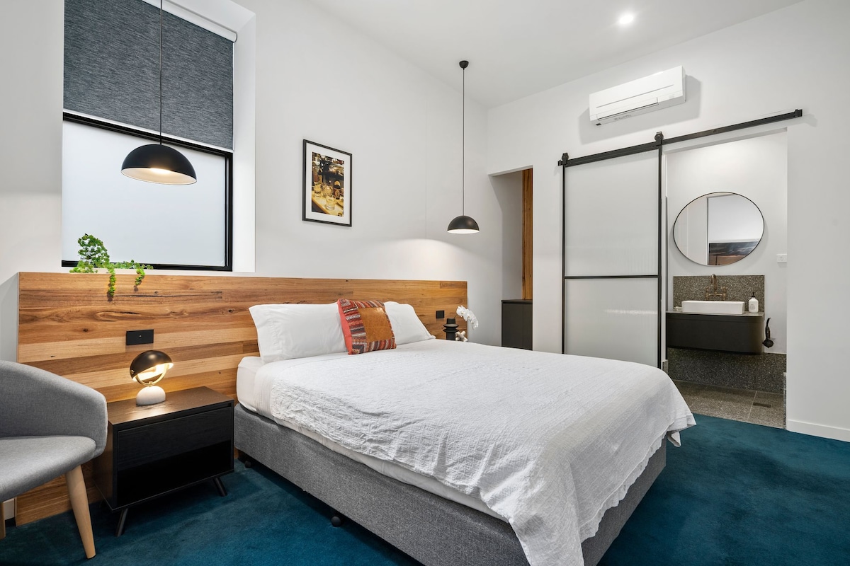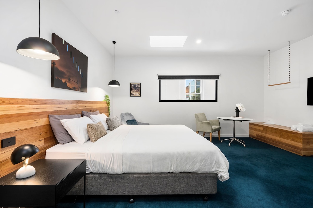 सेंट्रल गिलॉंगमध्ये सुरक्षित, स्टाईलिश निवासस्थान प्रदान करणे हे आमचे उद्दीष्ट आहे. तिथे जे काही पाहायचे आहे ते पाहण्याचा हा तुमचा आधार आहे. किंग साईझ बेड, रूम टीव्हीमध्ये - एक मिनी बार (स्टॉक केलेले किंवा स्टॉक न केलेले). पूर्णपणे स्टाईल केलेले बाथरूम. बाहेर पडण्यापूर्वी तुम्हाला ते हवे असल्यास आम्ही चहाचे केटल ऑफर करतो पण कृपया कार्टेल, कोलंबियन किंवा द बाल्टिक फॉर कॉफीवर जा. तुम्हाला सेट अप करण्यासाठी जागा हवी असल्यास वर्क डेस्क आहे आणि अर्थातच आमच्याकडे फास्ट वायफाय आहे. रूममध्ये नैसर्गिक प्रकाश आहे. ठिकाणे पाहणे/जाणे आवश्यक आहे जवळ