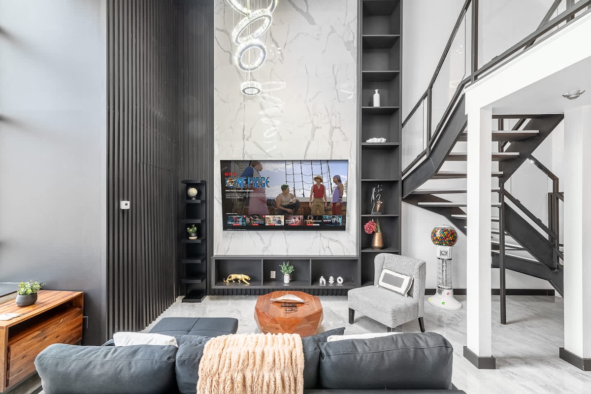 आधुनिक सिटी लॉफ्ट | 80” टीव्ही | जमिनीपासून छतापर्यंतचे व्ह्यूज