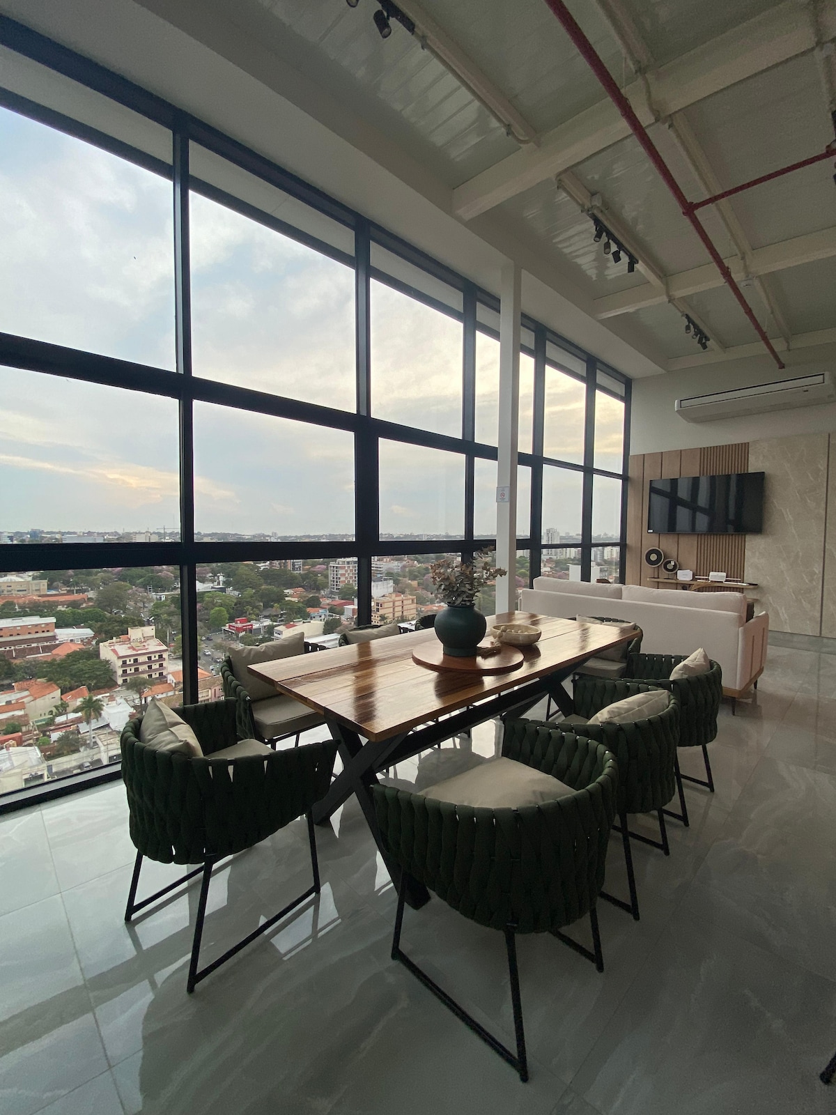 Exclusivo departamento en el último, 16vo piso con terraza privada. Excelente ubicación en la zona vip residencial de Asunción. Terraza privada con parrilla, comedor exterior para 8 personas y área de estar. Vista panorámica de la ciudad y atardecer en la Bahía. Cuenta con un dormitorio matrimonial súper king en suite con TV Smart y servicio de TV Cable. Otra habitación doble en suite, y una habitación pequeña con sofá cama, que cuenta solo con ventilador y baño enfrente.