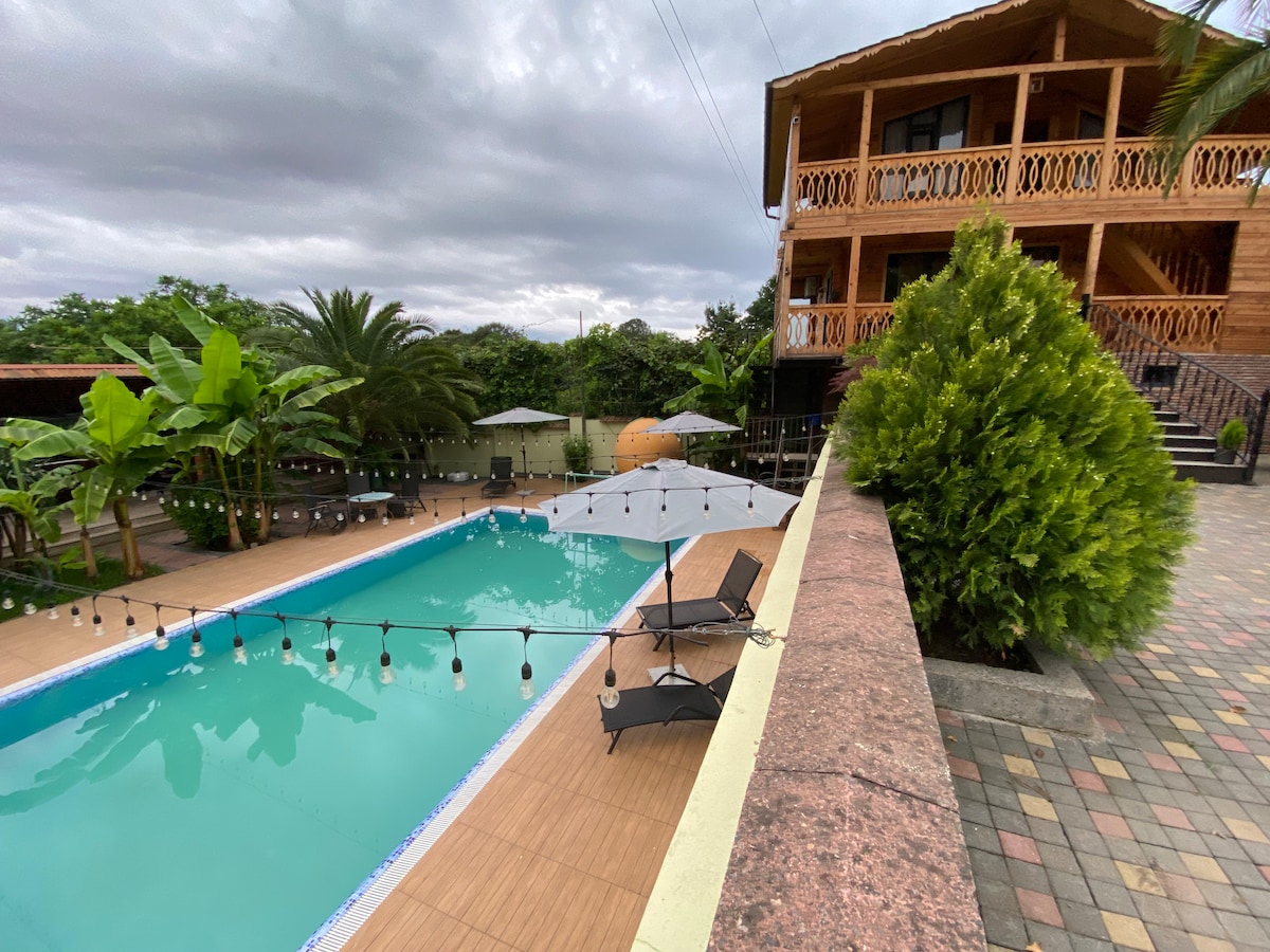 या अनोख्या आणि कुटुंबासाठी अनुकूल इको - व्हिलामध्ये काही आठवणी बनवा. व्हिला नटनेबीला अलीकडेच त्याच्या पूर्वीच्या वैभवात पुनर्संचयित करण्यात आले आहे. बागेत तुम्ही सीझननुसार सर्व स्थानिक फळांचा आनंद घेऊ शकता (टँगरीन, वॉलनट्स, नट्स, किवी, सफरचंद, पेअर्स, द्राक्षे, लिंबूवर्गीय, गोंगाट, पीचेस, अंजीर, प्लंम्स इ.). तुम्ही वर्षभर गरम पूलचा आनंद घेऊ शकता. आम्ही प्रसिद्ध मॅग्नेटिक सँड बीचपासून 13 किमी, बाटुमीपासून 48 किमी आणि कुटाईसी विमानतळापासून 87 किमी अंतरावर आहोत.