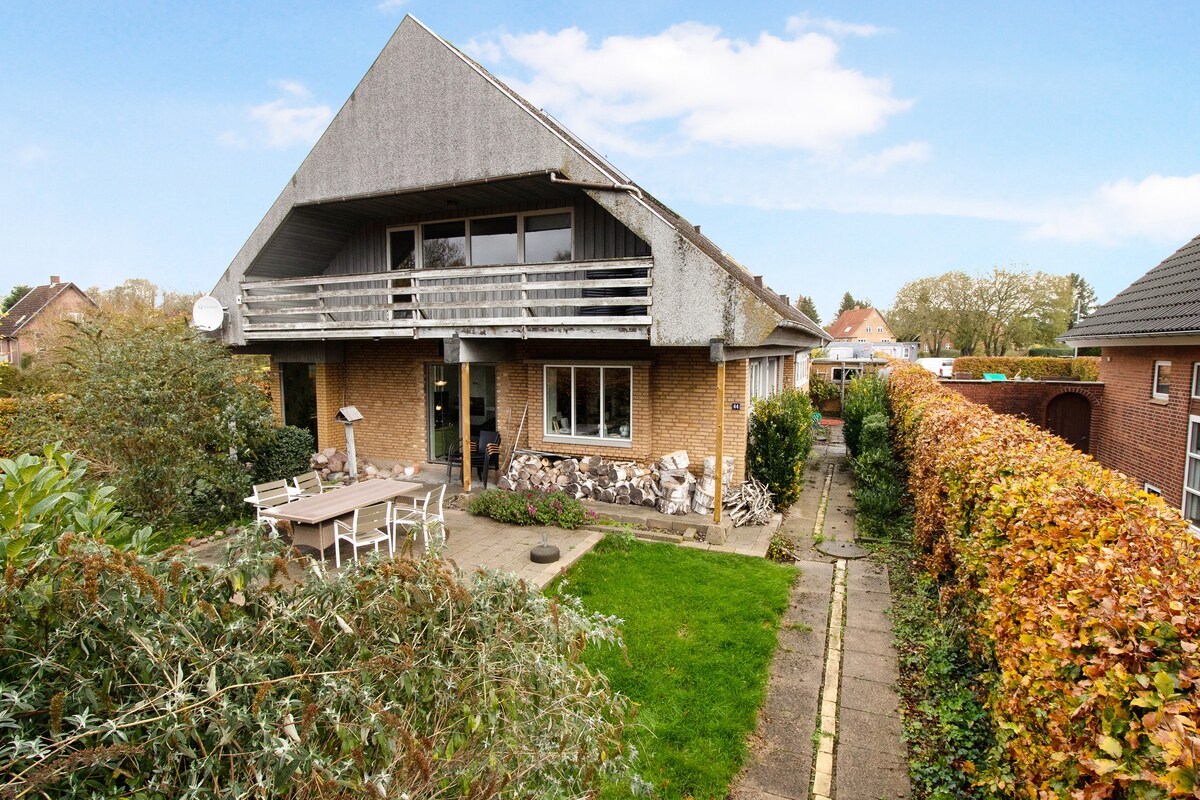 4 (6) लोकांसाठी घर दक्षिण जुटलँडमधील निसर्गरम्य आणि शांत वास्तव्यासाठी तुमच्या बॉयफ्रेंडला किंवा संपूर्ण कुटुंबाला घेऊन या. क्युल-डी-सॅकच्या शेवटी एक मोठा निसर्ग प्लॉट आहे. मोठ्या लाकडी टेरेसवर किंवा लिव्हिंग रूममधील हॉट पेलेट स्टोव्हसमोर आराम, बोनफायर आणि आरामदायक तासांच्या अनेक संधी. निसर्गाला घरात आणण्यावर लक्ष केंद्रित करून हे घर वैयक्तिकरित्या आणि अनोखेपणे सुशोभित केलेले आहे. 4 बेड्स आहेत आणि एका चांगल्या रुंद सोफ्यावर 2 बेड्स बनवण्याची शक्यता आहे