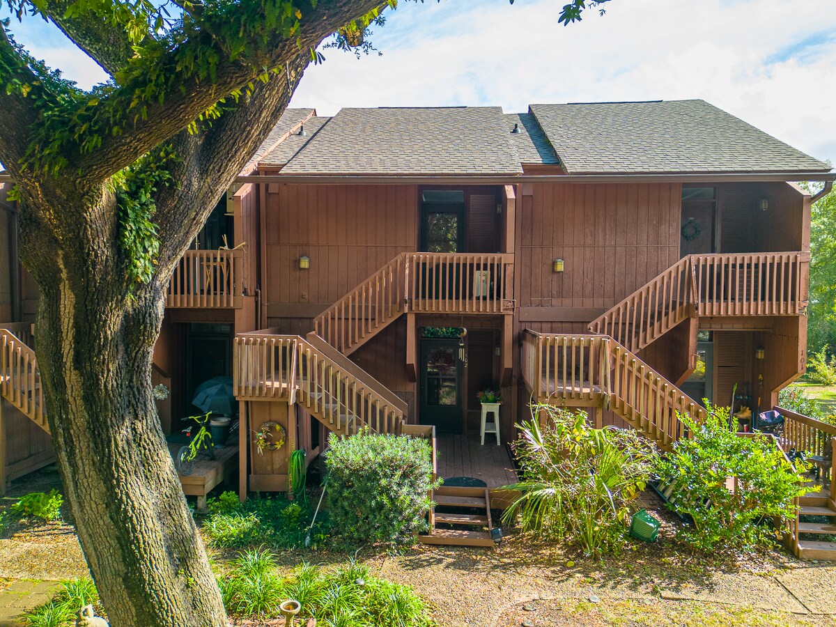 कंट्री क्लब आणि गोल्फच्या 36 छिद्रांपासून दूर! लेकसाईड व्हिलाजमधील तलावाजवळील दुसऱ्या मजल्यावरील काँडोचे नूतनीकरण केले आणि अपडेट केले. आमचा स्टुडिओ काँडो उबदार, उज्ज्वल वातावरणात पूर्ण किचन, फायरप्लेस आणि स्मार्ट टीव्हीसह 4 जणांसाठी झोपण्याची ऑफर देतो. गोल्फच्या एक दिवसानंतर आराम करण्यासाठी किंवा तलावाजवळील पूलमध्ये आराम करण्यासाठी कव्हर बॅक पोर्च ही योग्य जागा आहे. प्रौढ ओक्स, सेटिंगसारखे पार्क करा. कॉम्प्लेक्स क्लबहाऊस आणि ग्रिल+बारच्या बाजूला आहे. फॅन फेव्हरेट प्रॉपर्टी!