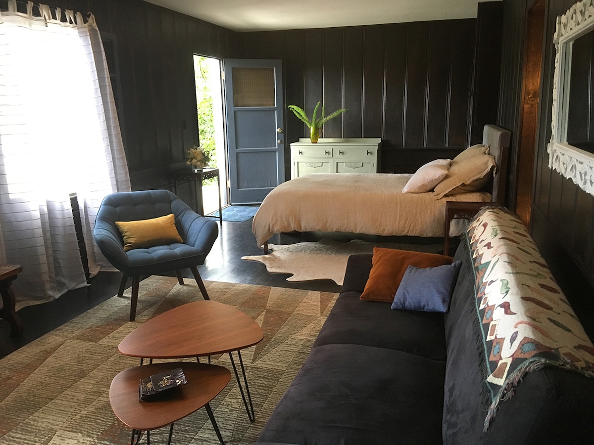 This 1-bedroom/1-bathroom house- 50min to SoFi Stadium. Built in the early 1940s, its decor is a nod to that era's timeless charm. Blackout drapes enhance the sleeping areas for a restful night's sleep. The beverage bar features ample cabinetry, an accent wall with backsplash, and unique open live edge shelves, crafted from the old avocado tree that once graced the patio. The patio has since been transformed with outdoor furniture, making it perfect for leisurely moments outdoors.