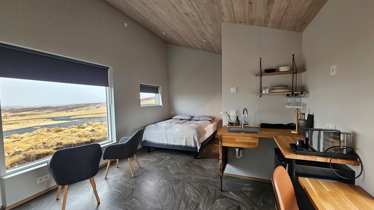अपार्टमेंट B मध्ये शांतता, गोपनीयता आणि आमच्या शांत आइसलँडिक फार्मचे मनमोहक दृश्ये पाहायला मिळतात. शुद्ध निसर्ग आणि ताज्या डोंगराच्या हवेने वेढलेल्या शेअर्ड जिओथर्मल हॉट टब आणि कोल्ड प्लंजमध्ये आराम करा. हिवाळ्यातील स्पष्ट रात्रींमध्ये, तुम्ही वर उत्तरी लाइट्स पाहू शकता आणि आमच्या डोंगरावरून सरळ वाहणाऱ्या स्वच्छ पाण्याचा आनंद घेऊ शकता, Staðarhnjúkur. अकुरेरीपासून 10 मिनिटांच्या अंतरावर आणि जवळपास बर्याच ॲक्टिव्हिटीज आहेत. तुम्ही उजव्या बाजूला अपार्टमेंट B पाहत आहात.