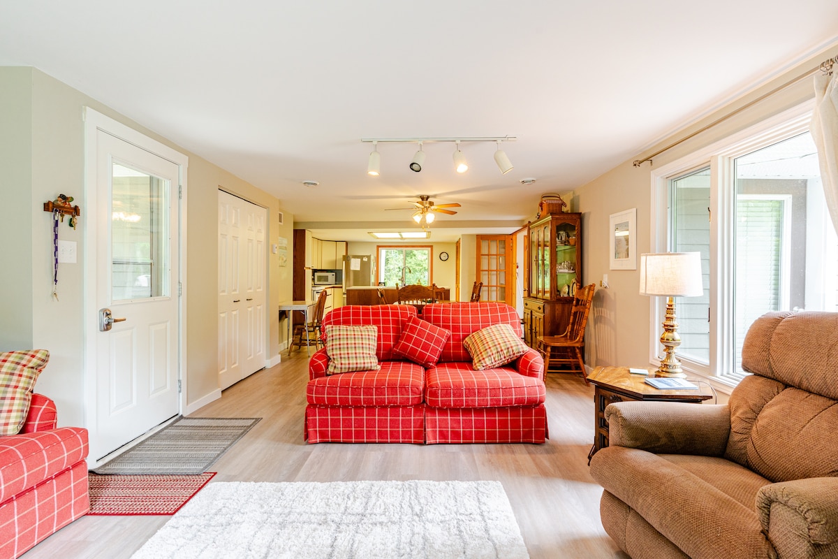 Tucked away among mature trees our charming Yellow Cottage offers privacy and a peaceful setting. The property includes parking for two vehicles and a fire pit in the yard-perfect for gathering under the stars and enjoying quiet evening campfires. Inside, the cottage blends rustic charm with refined comfort, featuring cathedral ceilings and a warm, open concept living space. The cottage comfortably sleeps guests in a private bedroom or an open loft each with a queen bed.