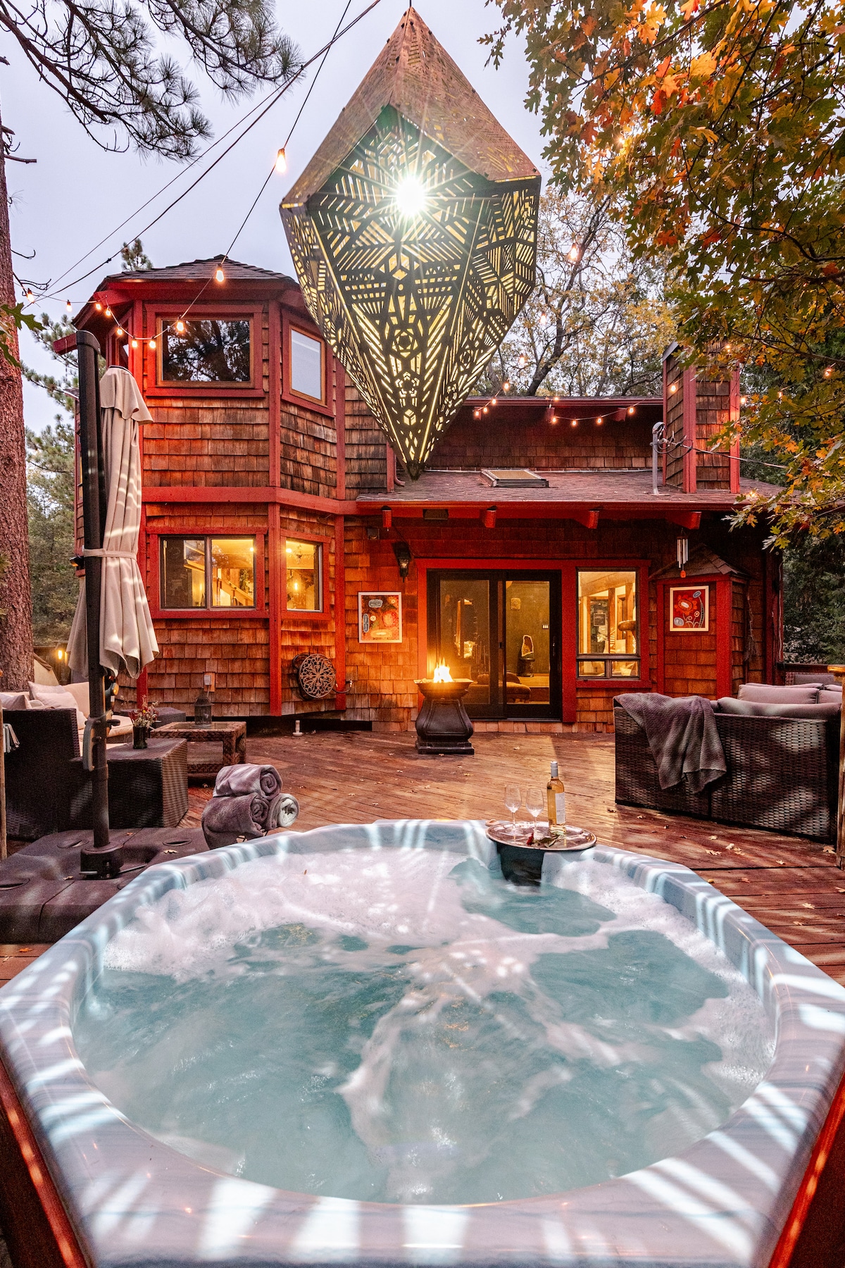 Bright and spacious with amazing views of Tahquitz/Lily Rock, hills to the North and pine forest to the South. Grand Room has massive windows - views of rolling hills. Lots of entertainment - TVs, projector, board games, air hockey, foosball... Walk to art shops, pubs and restaurants. Fast internet. Perfect for families, groups, work from home, longer stays and getaways. 2 hrs from San Diego, Los Angeles and Orange County. EV Charger on site! Soak in the peace. Yurt is a game/entertainment room.
