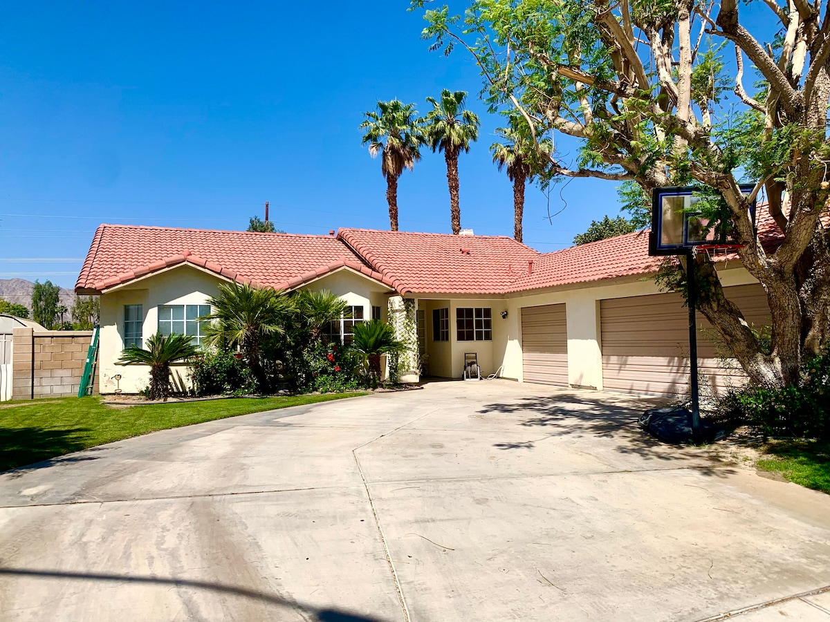 सिटी आयडी# 4645, TOT# 7829 परफेक्ट पाम स्प्रिंग्ज गेटअवे! खाद्यपदार्थ, ॲक्टिव्हिटीज, आकर्षणे आणि गोल्फ, पूर्णपणे स्टॉक केलेले ओपन किचन, मोठा पूल असलेले मोठे हिरवेगार बॅकयार्ड, बार्बेक्यू, हॉर्सशू गेम, फ्रिस्बी गोल्फच्या जवळ. वर्किंग डेस्क, हाय स्पीड वायफाय (संपूर्ण), वायफाय प्रिंटर, वायफाय स्पीकर्स, स्मार्ट टीव्ही, अतिरिक्त गॅरेज फ्रिज, बेडसाईड लॅम्प्स वाई/यूएसबी पोर्ट्स, गॅरेज वाई/योगा/व्यायाम/लाउंज जागा आणि मोठा टीव्ही, 50 amp 14 -50 EV चार्जर, 5 दिवस किमान, बुकिंग गेस्ट 25 असणे आवश्यक आहे, पवन मार्च - मे. कॅमेरा डोअरबेल.