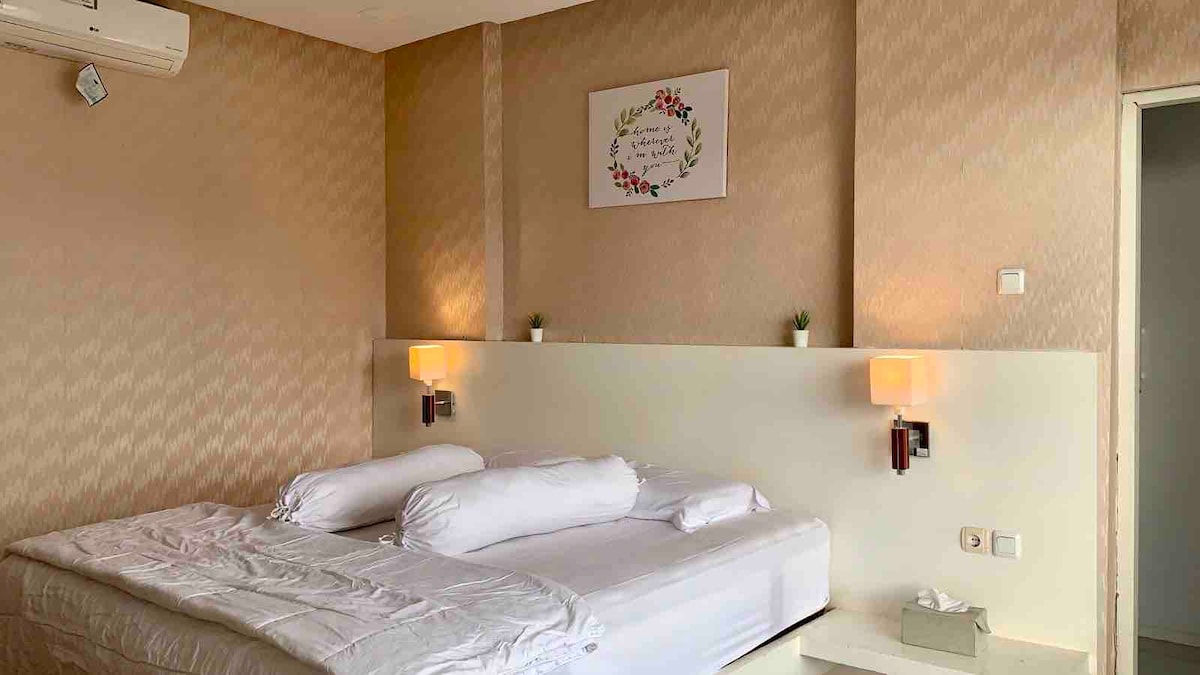 हॅलो आणि बोगोर व्हरांडामध्ये तुमचे स्वागत आहे! मुख्य घराच्या अगदी बाजूला वसलेली, बोगोर व्हरांडा 1 ही एक स्टुडिओ टाईप केलेली रूम आहे जी लहान पॅन्ट्री, डायनिंग टेबल, किंग साईझ बेड, सोफा बेड, वायफाय इ. सह पूर्ण झाली आहे. जवळच्या मॉलपासून फक्त 5 मिनिटांच्या अंतरावर आणि बोगोर बोटॅनिकल गार्डनपासून 8 मिनिटांच्या अंतरावर आणि बस स्टेशनपासून 3 मिनिटांच्या अंतरावर आहे जे तुम्हाला विमानतळापर्यंत घेऊन जाईल.