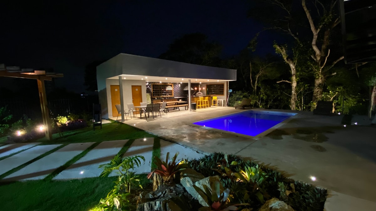 अडाणी फर्निचरने सजवलेल्या या घरात संपूर्ण कुटुंबासह आराम करा. घर काँडोमिनियममध्ये आहे, एअर कंडिशनिंगसह 3 प्रशस्त सुईट्स आहेत. गादी नवीन आहेत, शॉवर्स गॅस गरम आहेत. लिव्हिंग रूम प्रशस्त आहे, फायरप्लेस आणि एअर कंडिशनिंग आहे, टीव्ही 65"स्मार्ट आहे. बार्बेक्यू प्रदेशात स्टोव्ह आणि लाकडी ओव्हन आहे. पूल भागात लॉकर रूम, 2 सनगार्ड्स आणि 2 सन लाऊंजर्स आहेत. गरम पूल. खेळाचे मैदान फॅमिली रेंटल. वाढीव सुट्टीसाठी किमान 4 रात्री.