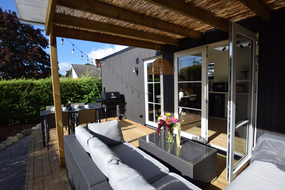 जागे व्हा आणि Sölvesborgsviken च्या नजरेस पडून नाश्ता करा. हे घर माझ्या प्रॉपर्टीवरील केबिनमध्ये आहे. हे ग्रामीण पण मध्यवर्ती आहे ज्यामुळे तुमचे वास्तव्य आरामदायी होते. खाडीच्या बाजूने पार्कमधून फक्त किमी चालत असताना तुम्ही दुकाने, रेस्टॉरंट्स आणि कॅफेसह उबदार शहराच्या मध्यभागी जाता. गोल्फ कोर्स पायी किंवा बाईकवरून युरोपमधील सर्वात लांब पादचारी आणि सायकल ब्रिजवरून 2.5 किमी अंतरावर आहे. रायसबर्गचे हायकिंग आणि बाइकिंग ट्रेल्स फक्त 1,5 किमी अंतरावर आहेत. आजूबाजूच्या परिसराचे वाळूचे समुद्रकिनारे असंख्य आहेत.