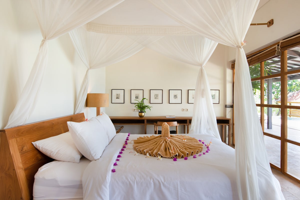हिरव्या टेकड्यांनी वेढलेल्या 100+ हेक्टर पॅडीजच्या सीमेवरील व्हिला ब्लू स्टेप्स शहराच्या मध्यभागी फक्त 10 -15 मिनिटांच्या अंतरावर आहे, चालणे, सायकल ट्रिप्स किंवा फक्त आराम करण्यासाठी योग्य असलेल्या भागात. हे पूर्ववत केलेले पारंपारिक घर सर्व सुविधा, खाजगी गार्डन आणि पूलसह सुसज्ज आहे. ब्रेकफास्ट समाविष्ट आहे आणि आम्ही आमच्या जवळपासच्या ब्लू स्टेप्स रेस्टॉरंटमधून सर्व जेवणांची पूर्तता करू शकतो. व्हिला ब्लू स्टेप्स ही कुटुंबासमवेत काही खाजगी वेळ घालवण्यासाठी किंवा एकत्र काही रोमँटिक दिवस घालवण्यासाठी एक अपवादात्मक जागा आहे! आमचे रिव्ह्यूज पहा!