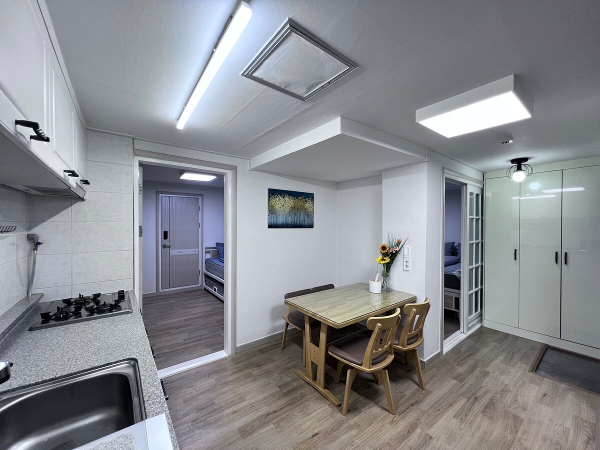 ◈방◈ क्वीन बेड बिल्ट - इन कॅबिनेट ड्रेसिंग टेबल टेबल टीव्ही एअर कंडिशनर. हेअर ड्रायर ◈बाथरूम◈ शॅम्पू आणि कंडिशनर आणि बॉडी वॉश आणि फोम क्लीनर हँड सॅनिटायझर आणि डिस्पोजेबल टूथब्रश आणि रेझर टूथपेस्ट टॉवेल्स ◈किचन◈ रेफ्रिजरेटर, गॅस स्टोव्ह, मायक्रोवेव्ह, कॉफी पॉट वाट्या आणि मग, सोजू ग्लासेस, विविध मूलभूत मसाले भांडी आणि पॅन आणि भांडी ◈इतर◈ वॉशिंग मशीन (लाँड्री डिटर्जंट) स्वच्छता साधने विनामूल्य वायफाय पायी 1 मिनिटाच्या अंतरावर सुविधा स्टोअर 2 मिनिटांच्या वॉकमध्ये विविध रेस्टॉरंट्स डेजियॉन स्टेशनपासून कारने 5 मिनिटे जंगांग्नो स्टेशनपासून 5 मिनिटांच्या अंतरावर डाउनटाउन बँक - डॉंगपर्यंत 10 मिनिटांच्या अंतरावर भूमिगत शॉपिंग मॉलपासून 2 मिनिटांच्या अंतरावर
