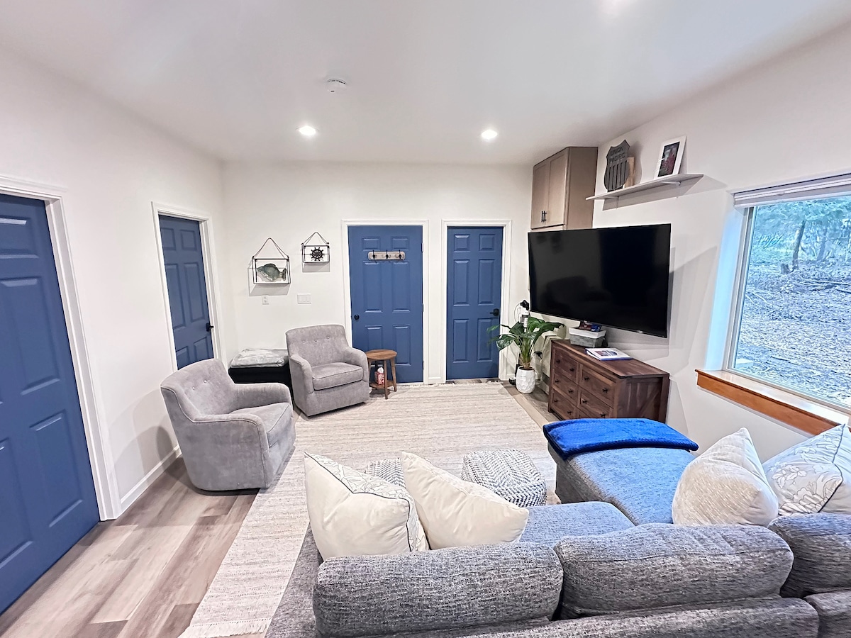 मुख्य मजल्याच्या बेडरूममध्ये क्वीन बेड आहे. दुसऱ्या मजल्यावरील "नेस्ट" मध्ये एक क्वीन बेड आणि 3 सिंगल्स आहेत. सर्व नोव्हा फॉर्म मॅट्रेसेस. किचनची जागा सेव्हर पायऱ्या खालच्या लॉफ्टकडे जातात ज्यात जुळे बेड आणि क्वीन बेडसह वरचा लॉफ्ट आहे. कुएरिग के - कप्स, ड्रिप कॉफी. किचनमध्ये कुकिंगची भांडी आणि भांडी आहेत. बाथरूममध्ये एक अनोखा शॉवर आहे, ज्यामध्ये शॅम्पू आणि बॉडी वॉशचा साठा आहे. प्लश टॉवेल्स दिले आहेत. युनिटच्या समोरील बाजूस कम्युनिटी लाँड्री. सामावून घेण्यासाठी एक सरळ फ्रीजर आहे!