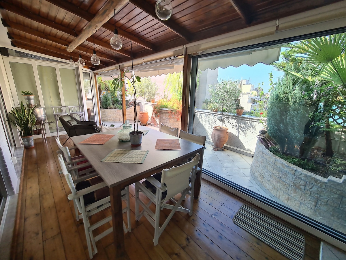 फ्लिस्वॉस बीचसमोर, सारोनिकोस गल्फच्या समुद्राकडे पाहत असलेल्या विशाल 170 चौरस मीटर व्हरांडा असलेले एक विशेष पेंटहाऊस (8 वा मजला) 110 चौरस मीटर अपार्टमेंट, गोपनीयतेची संपूर्ण भावना देते. हे समुद्र, आकाश आणि शहरी वातावरण यांच्यातील एक परिपूर्ण मिश्रण आहे. यात एक मोठी लिव्हिंग रूम आणि एक किचन आहे ज्यात काचेच्या व्हरांडाच्या दरवाजांच्या सभोवतालच्या 4 लोकांसाठी एक टेबल आहे. यात एक मोठी बेडरूम आहे, प्रत्यक्षात एकामध्ये दोन सामान्य बेडरूम्स आहेत, ज्यात जिम सायकल, बेंच, वेट्स, मॅट, ऑफिस डेस्क आणि 2 कपाट आहेत.