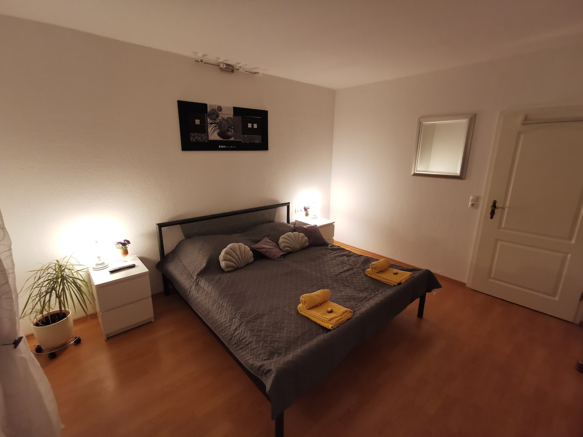 Liebe G├дste! Hiermit bieten wir eine ruhige 3- Zimmer-Wohnung, die sich im 2. OG /Dachgeschoss eines 2 Familien Hauses befindet und ├╝ber die Treppe von einem gemeinsamen Eingang aus zu erreichen ist. Die Wohnung beinhaltet 3 Zimmer: ein Schlafzimmer mit einem gro├Яen Doppelbett, ein Arbeitszimmer, wo noch ein zus├дtzliches Bett steht, ein Wohnzimmer, eine K├╝che und Bad. Die Anbindung in die Stadtmitte ist gut, ca 10min mit der Bahn. Parken ist leider nur in der Nebenstrasse m├╢glich
