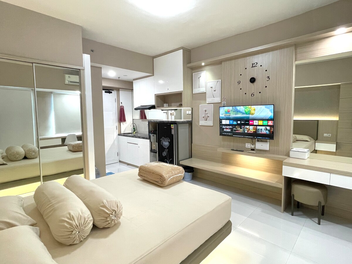 Apartemen Tanglin Studio Plus 29m2. City View. - Queen Bed - Air Conditioner - Water Heater - Hair dryer - Unlimited Wifi - Android TV 43 inch - Netflix - Clock - Dressing Table - Wardrobe - Writting Table - Bed side table - Folding Dining Table - Pantry Cabinet - Rice Cooker - Steinlees Steel Sink - Refrigerator - Hot/Cold Dispenser mineral water - Electric Induction Cooker Hob - Cooker Hood - Induction Fry Pan, bowl, plate, glass, etc. Note: during the stay there is no cleaning service