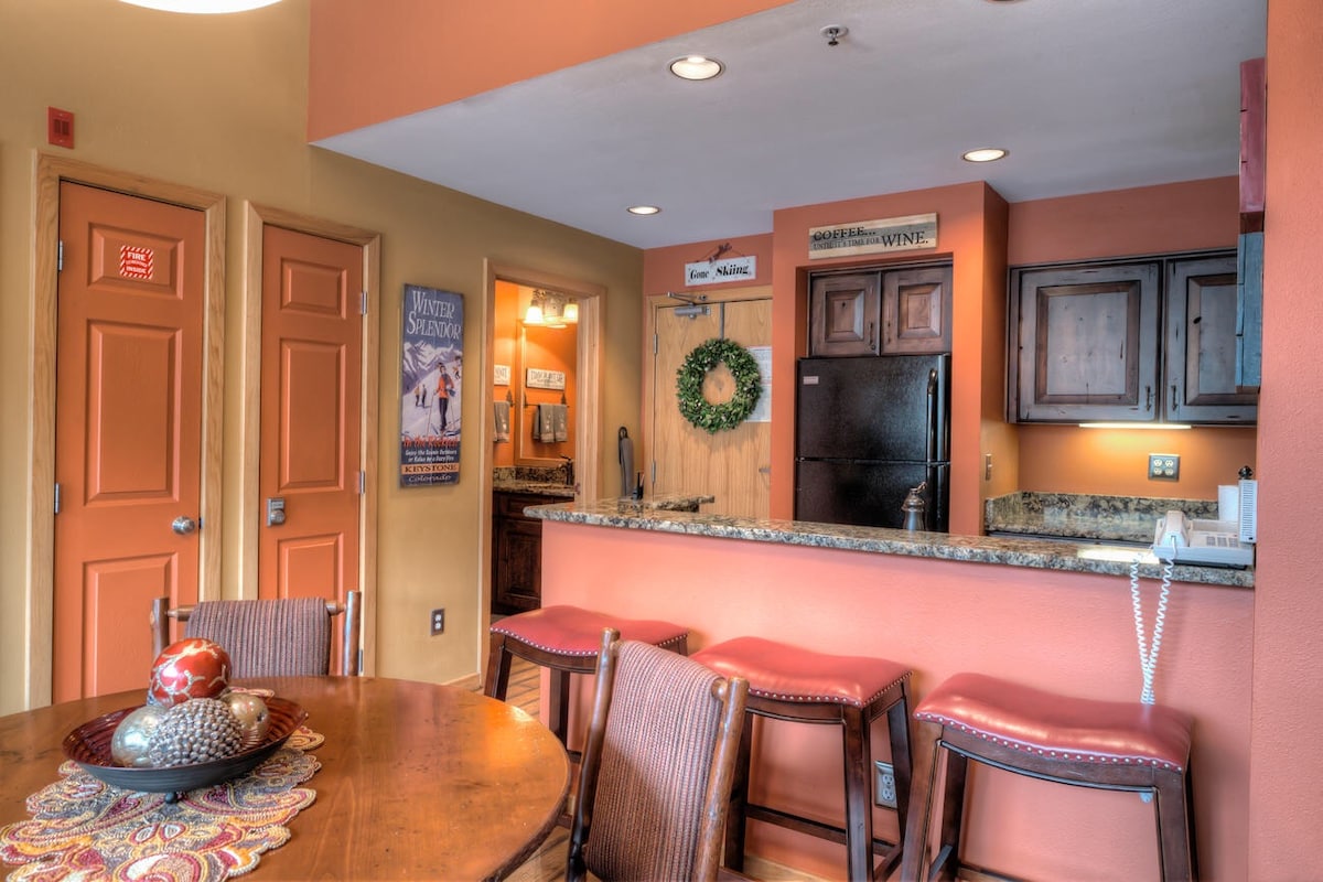आमचा अनोखा काँडो तुम्हाला कीस्टोनच्या मध्यभागी ठेवतो परंतु दिवसाच्या शेवटी शांततेत सुटकेची परवानगी देतो. गोंडोला, रेस्टॉरंट्स आणि रिव्हर रनमधील इतर सर्व ऑफर्सपर्यंत फक्त 5 मिनिटांच्या अंतरावर! परत आल्यावर, तुम्ही कीस्टोनमधील काही सर्वोत्तम दृश्यांचा आनंद घ्याल - उतार, तलाव आणि पाणथळ जागांचे अखंड, शांत व्हिस्टा (आणि तुम्ही भाग्यवान असल्यास मूस). ही उबदार जागा किंग बेड आणि क्वीन मर्फी बेडच्या दरम्यान 4 आरामात झोपते आणि तुमच्यासाठी अद्भुत आठवणी बनवण्यासाठी तयार आहे!
