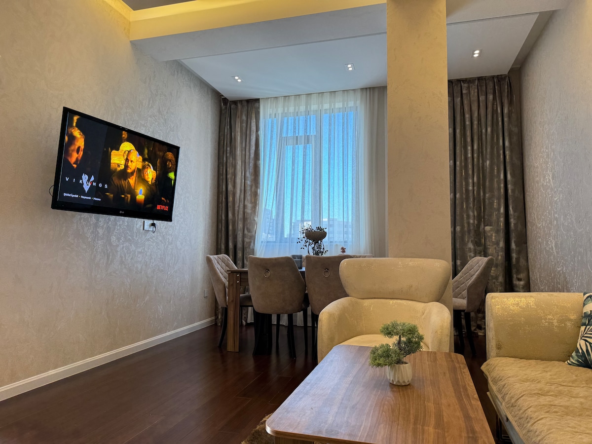 ** मला हंगामी सवलतीसाठी मेसेज पाठवा ** फ्लेम टॉवर्स आणि कॅस्पियन समुद्राच्या अप्रतिम दृश्यासह हा आरामदायक एक बेडरूमचा फ्लॅट, 3 लोकांपर्यंत आरामात झोपू शकतो. हे नवीन फर्निचर आणि आधुनिक इंटिरियरसह येते. हा फ्लॅट शार्ग बाजारच्या अगदी समोर आहे आणि आयकॉनिक हेदर अलीयेव सेंटरपासून 15 मिनिटांच्या अंतरावर आहे. फ्लॅट याझिल बाजार (ग्रीन बाजार) पासून 1 - मिनिटांच्या अंतरावर आहे जिथे तुम्ही स्थानिक ऑरगॅनिक उत्पादनांचा आनंद घेऊ शकता. या फ्लॅटचे नुकतेच सर्वोच्च स्टँडर्ड्सवर नूतनीकरण केले गेले आहे