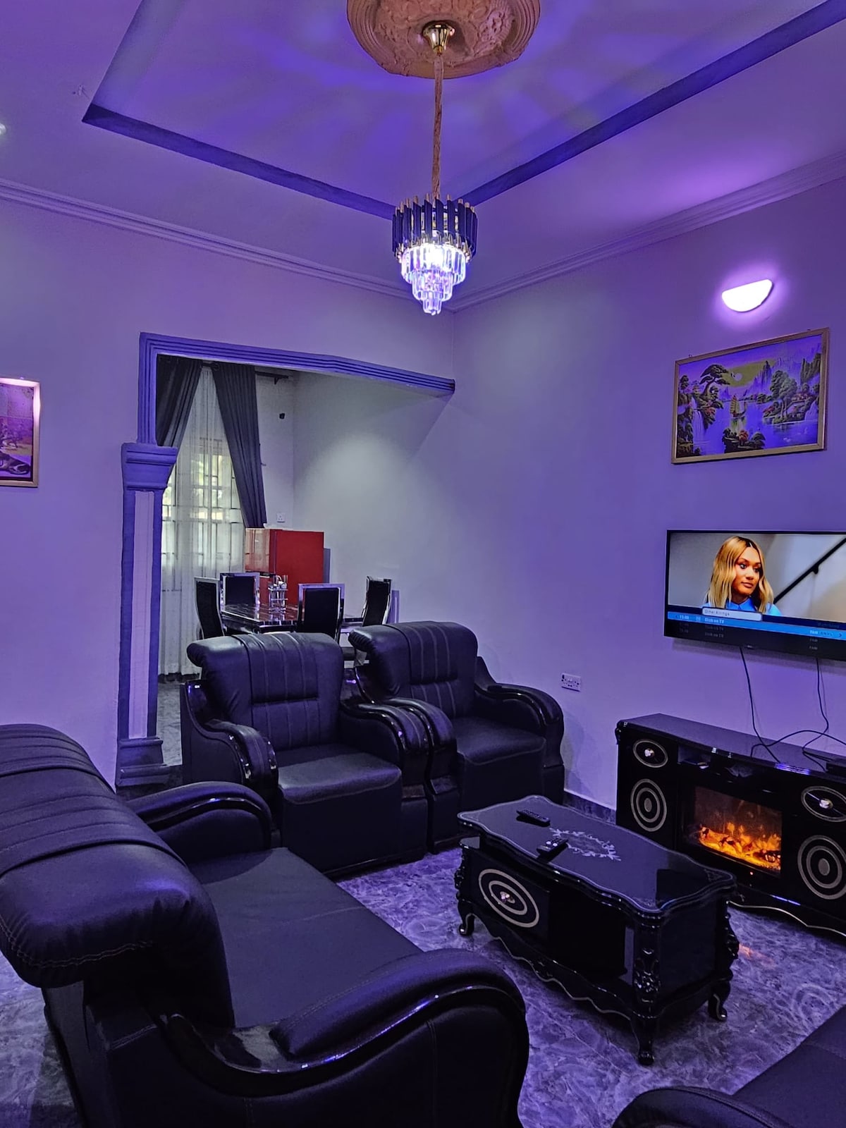 This stylish upscale home has 3 rooms and 3 baths on this listing, it is your ideal, peaceful place for vacation and family events with ample space for parties, guest entertainments and other social activities. All rooms are ensuite, furnished with standing fans, King size beds, work space and keys. Host is available to assist 24/7. You're a few minutes away from Irrua and Ekpoma local markets. Home have 24 hours Solar power, onsite security guide, spacious Kitchen and 75'' TV with DSTV