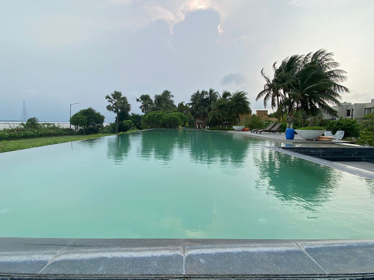 व्हिलामध्ये 3 बेडरूम्स, 4 बाथरूम्स, बेड लिनन, टॉवेल्स, फ्लॅट - स्क्रीन टीव्ही, डायनिंग एरिया, पूर्णपणे सुसज्ज किचन आणि तलावाच्या दृश्यांसह बाल्कनी आहे. एअर कंडिशन केलेल्या व्हिलामध्ये बसण्याची जागा, वॉशिंग मशीन आणि स्लीपर्स असलेले बाथरूम देखील आहे. तुम्हाला ही जागा शोधायची असल्यास, जवळपास सायकलिंग करणे शक्य आहे. सर्वात जवळचे विमानतळ नेताजी सुभाषचंद्र बोस आंतरराष्ट्रीय विमानतळ आहे, जे व्हिलापासून 67.6 किमी अंतरावर आहे. या शांततेत राहण्यासाठी संपूर्ण कुटुंब आहे.