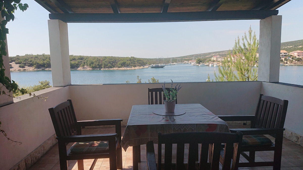 संपूर्ण वर्षभर आरामदायक वास्तव्यासाठी आरामदायक भूमध्य अपार्टमेंट. समुद्राचे अप्रतिम दृश्य असल्यास पहिल्या मजल्यावर वसलेले. किचन पूर्णपणे सुसज्ज आहे (डिश वॉशर, मायक्रोवेव्ह, ब्लेंडर, डॉल्स गस्टो कॉफी मशीन, ओव्हन इ.) ज्यामध्ये डायनिंग/लिव्हिंग रूम आणि मरीनाकडे पाहणारी प्रशस्त टेरेस आहे. दोन डबल बेडरूम्स आहेत, त्यामुळे ते चार व्यक्तींसाठी योग्य आहे. समुद्र आणि एक खाजगी डेक घराच्या समोर फक्त काही मीटर अंतरावर आहे...
