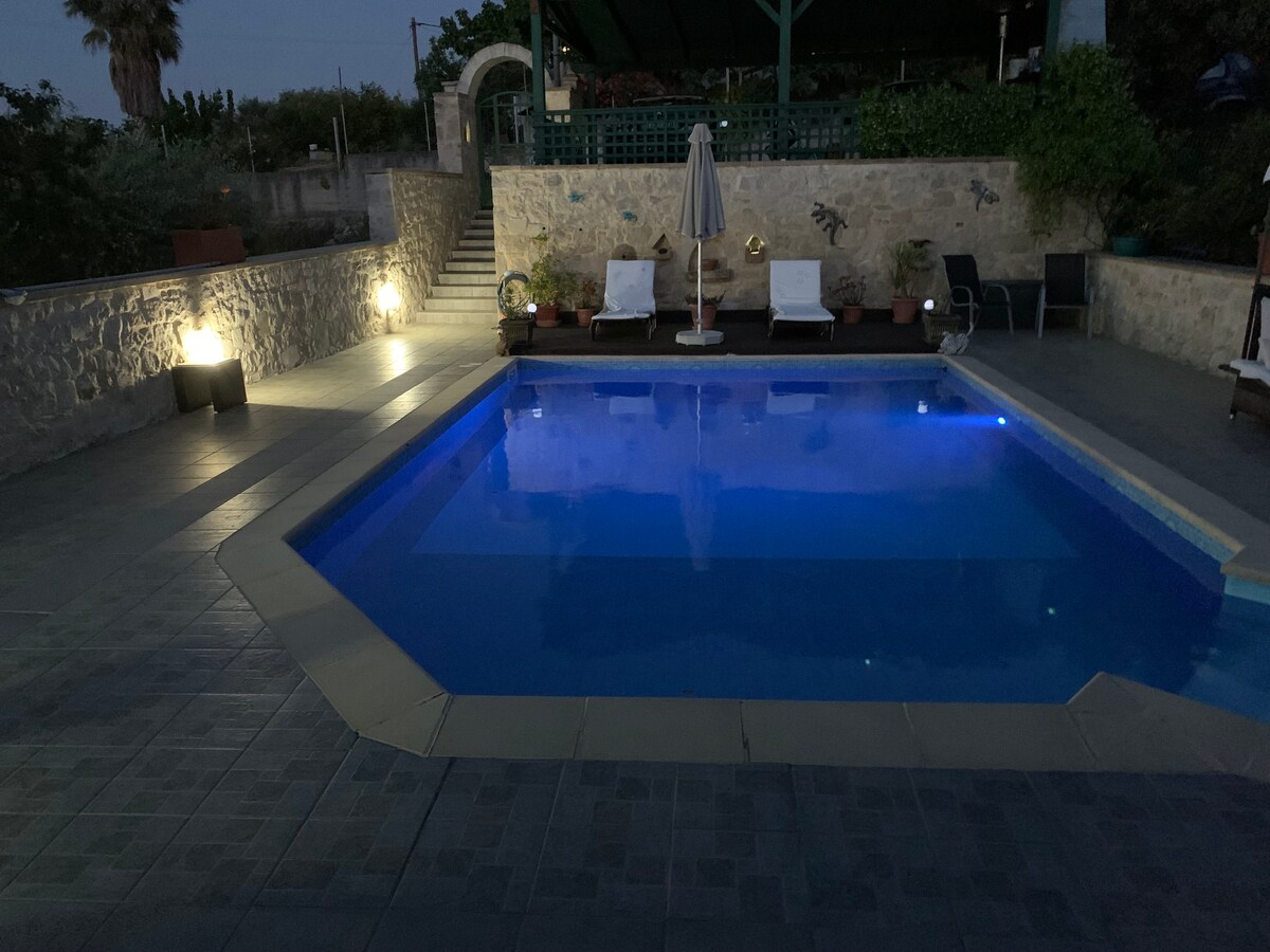 हे घर मोडी गावामध्ये, एका टेकडीवर, समुद्रापासून काही मिनिटांच्या अंतरावर आणि प्लाटानियाच्या पर्यटन सुविधांपासून आणि चानियापासून 15 मिनिटांच्या अंतरावर आहे. तुम्ही उबदार क्रेटन गावाचे जीवन अनुभवू शकता आणि पूलमध्ये पोहताना निसर्गाचे, ऑलिव्ह आणि नारिंगी झाडांच्या शेतांचे उत्तम दृश्य पाहू शकता. घर पारंपारिक आहे, दगड आणि लाकूड यासारख्या नैसर्गिक सामग्रीचा वापर करते आणि सर्व आधुनिक सुखसोयी प्रदान करते.