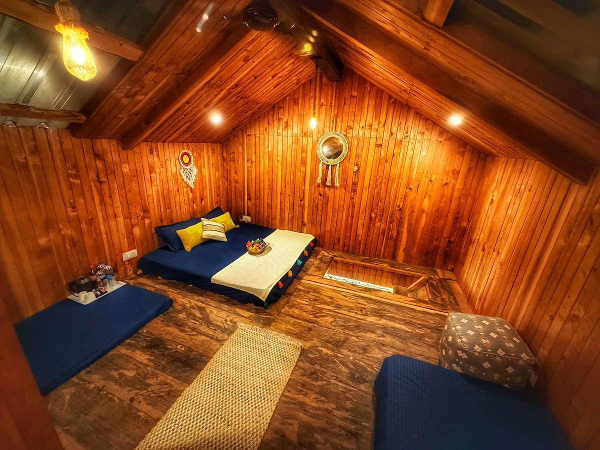 Mandukya is a luxury retreat in Tandi village, nestled in the majestic mountains 8km uphill from Jibhi . Our secluded cottages offer breathtaking views, high-end furnishings, and insulated walls for temperature control. Enjoy bath tubs facing the mountains and sauna baths for deep relaxation. In-house chef and automated food ordering system available for authentic Indian and international cuisine. Experience the ultimate mountain get away at Mandukya where luxury and nature meet.
