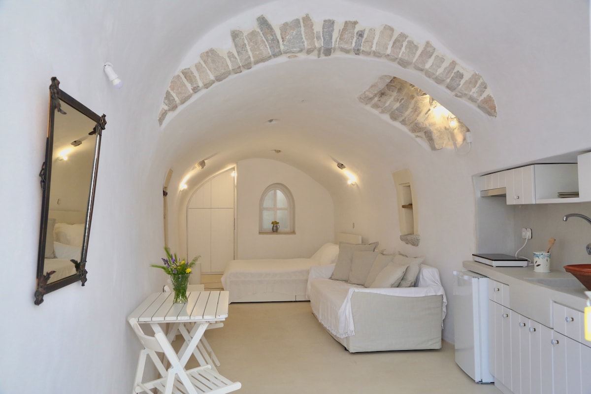 बेटाचे मुख्य विलाज चोरा येथे स्थित, हे अपार्टमेंट बेटाच्या सर्वात निसर्गरम्य रेस्टॉरंट्स आणि बारपासून काही मीटर अंतरावर आहे, तरीही, त्याच वेळी रात्रीच्या जीवनाच्या आवाजापासून दूर आहे. बेडरूम पारंपारिक गुहा शैलीमध्ये (खिडकी नाही) सेट केलेली आहे, तर किचन आणि लिव्हिंग रूममध्ये भरपूर नैसर्गिक प्रकाश आहे आणि (दोन मोठ्या खिडक्या आणि एक काचेचा दरवाजा) समुद्र आणि वस्ती असलेल्या टेकडीकडे पाहत आहे.