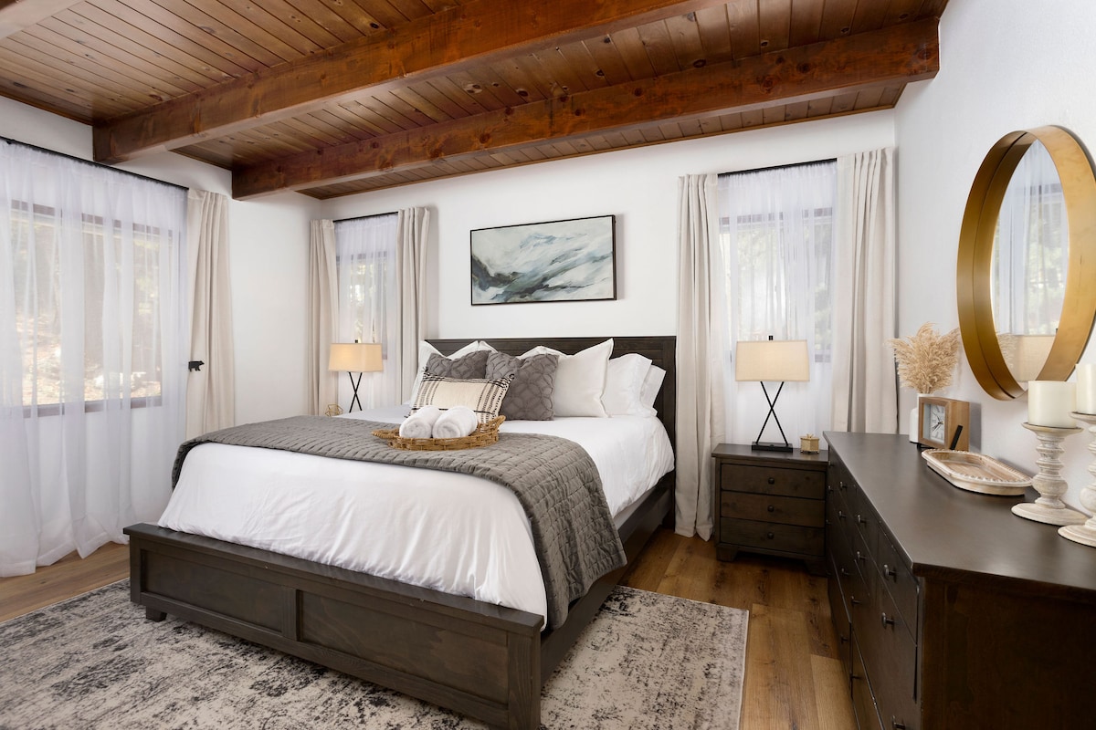 भव्य उंच पाइनच्या झाडांच्या दरम्यान वसलेले, मोठ्या 15,000 चौरस फूट लॉट* वर 5,200+ चौरस फूट लिव्हिंग स्पेसचे हे प्रशस्त केबिन आहे. आधुनिक सुविधा उबदार अडाणी मोहकतेची पूर्तता करतात. हे मुले आणि कुत्र्यांसाठी अनुकूल घर तलावापासून 10 मिनिटांच्या मजेदार चालण्याच्या अंतरावर आहे. यात एक बंद बॅकयड डब्लू/ रनिंग स्ट्रीम आणि फॉरेस्ट व्ह्यूज आहेत. आरामदायी आऊटडोअर डायनिंगसाठी दोन मोठे डेक/ फायर पिट आणि बार्बेक्यू. लेक ॲरोहेड व्हिलेजपासून थोड्याच अंतरावर~लेक फ्रंट डायनिंग, शॉपिंग, सांताज व्हिलेज, बोटिंग, हायकिंग, स्की आणि स्लेडिंग. (*डेक्ससह).