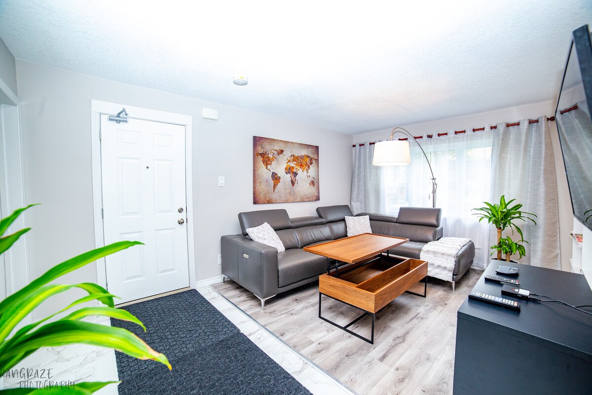 हे स्टाईलिश एक बेडरूमचे अपार्टमेंट 1 -2 लोक/जोडप्यांसाठी राहण्यासाठी योग्य जागा आहे. 2 प्रौढ कमाल. (दुर्दैवाने बाळ/मूल प्रूफ केलेले नसल्यामुळे मुले नाहीत) हे एक खाजगी पूर्ण तळघर अपार्टमेंट आहे ज्याचे स्वतःचे स्वतंत्र प्रवेशद्वार आहे. तुम्हाला तुमचे स्वतःचे किचन, बेडरूम, लिव्हिंग रूम, वॉशर/ड्रायर आणि बाथरूमचा ॲक्सेस असेल. **पूर्णपणे धूम्रपान किंवा रात्रभर गेस्ट्स नाहीत (अतिरिक्त शुल्क आकारले जाईल )** दीर्घकालीन वास्तव्यासाठी योग्य आणि तुम्हाला आवश्यक असलेल्या सर्व गोष्टी आहेत.