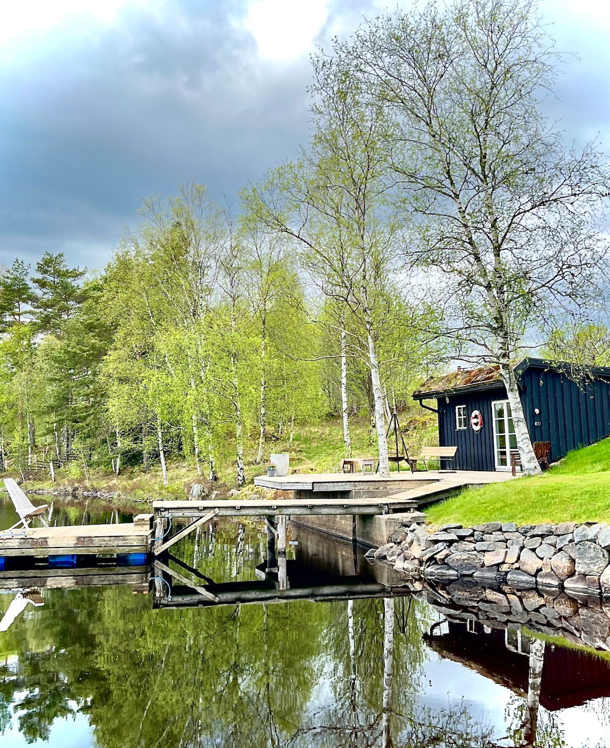 स्वतःच्या तलावाजवळील मोठे केबिन, सॉना, जेट्टी, कॅनो इ.