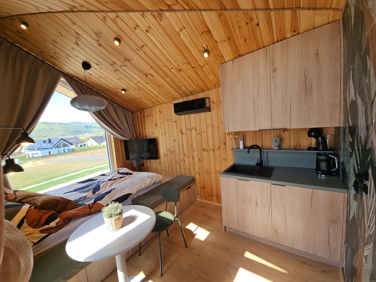 संपूर्णपणे लाकडापासून बनवलेले हे शाल्का, उंच लाकडी प्लॅटफॉर्मवर वसलेले आहे, ज्यामुळे त्याचे वातावरण अद्वितीय बनते. येथे तुम्हाला खरा शांततेचा अनुभव येईल, तुम्ही पूर्वी कधीही न झोपल्यासारखी झोप घ्याल. उन्हाळ्यात, लाउंजर किंवा हॅमॉकवर बसून जंगल, कुरण आणि फिरत्या प्राण्यांकडे पाहणे हा सर्वात मोठा आनंद आहे. तुम्ही बार्बेक्यू किंवा शेकोटीजवळ बसू शकता. पर्वतांमध्ये जाणे सुनिश्चित करा. आमच्याकडून तुम्ही संपूर्ण खोरे पाहू शकता. आम्ही एक आदर्श स्थान आहोत. आम्ही तुमच्यासाठी घरगुती ब्रेड बनवू.