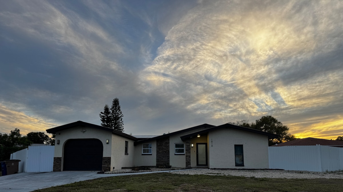 द पाम स्टे 🌴 मध्ये तुमचे स्वागत आहे, दक्षिण-पश्चिम फ्लोरिडामधील तुमचे उज्ज्वल आणि आरामदायक निवासस्थान. या आधुनिक, स्टायलिश घरात ओपन-कॉन्सेप्ट लेआऊट, उंच छत आणि एक प्रशस्त क्वार्ट्झ आयलंड असलेले पूर्णपणे सुसज्ज किचन आहे. आरामदायी आणि सोयीस्कर अशा पद्धतीने डिझाइन केलेले हे ठिकाण शांत आणि तणावमुक्त वास्तव्याच्या शोधात असलेल्या कुटुंबांसाठी, जोडप्यांसाठी किंवा रिमोट वर्कर्ससाठी परिपूर्ण आहे. शांत ट्रॉपिकल वातावरण, वेगवान वाय-फाय आणि तुम्हाला घरी असल्यासारखे वाटण्यासाठी आवश्यक असलेल्या सर्व गोष्टींचा आनंद घ्या.