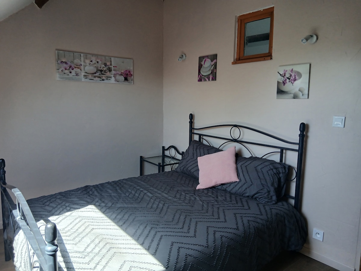 Petite maison mitoyenne au propriétaire, avec entrée indépendante. Idéalement située entre 2 a 3 km maxi de tous commerces (intermarche,lidl,boulangerie,tabac et pharmacie etc..)le logement comprend une piece a vivre ouvert sur la cuisine équipée d un refrigerateur congélateur, un piano de cuisson gaz,lave vaisselle, four micro-ondes, mini four,cafetière tassimo.2 chambres (1 lit double +1 lit bb)(1 lit double et 1 lit simple)1 salle de bain avec douche.Lave linge et wiffi,TV grand ecran.