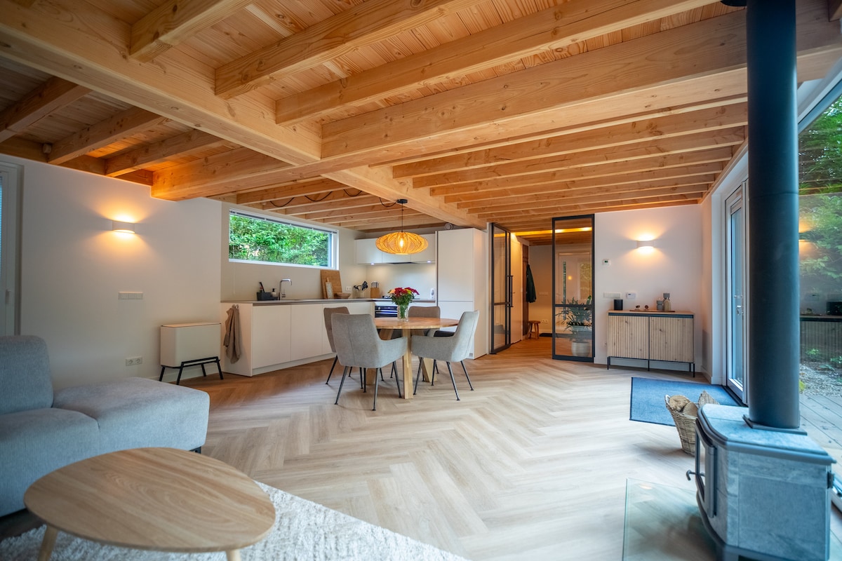वेलुवे येथे जंगलाच्या काठावर लक्झरी वेलनेस. इनडोअर स्विमिंग पूल, शॉवर्स, खाजगी बाथरूम आणि (फिनिश) सौनाचा खाजगी वापर असलेल्या दोन लोकांसाठी अद्वितीय गेस्ट हाऊस. खाजगी प्रवेशद्वार आणि पार्कसारख्या बागेत पूर्णपणे सुसज्ज स्वयंपाकघर. पाळीव प्राण्यांना परवानगी नाही! इमारत मुख्यतः (अंशतः प्रतिबिंबित) काचेची बनलेली आहे आणि त्याला पडदे नाहीत. होगे वेलुवे, एपलडॉर्न स्टेशन आणि पॅलेस हेट लो यांच्या सायकलिंग अंतरावर. माउंटन बाइकिंग, धावणे आणि सायकलिंगसाठी आदर्श स्थान.