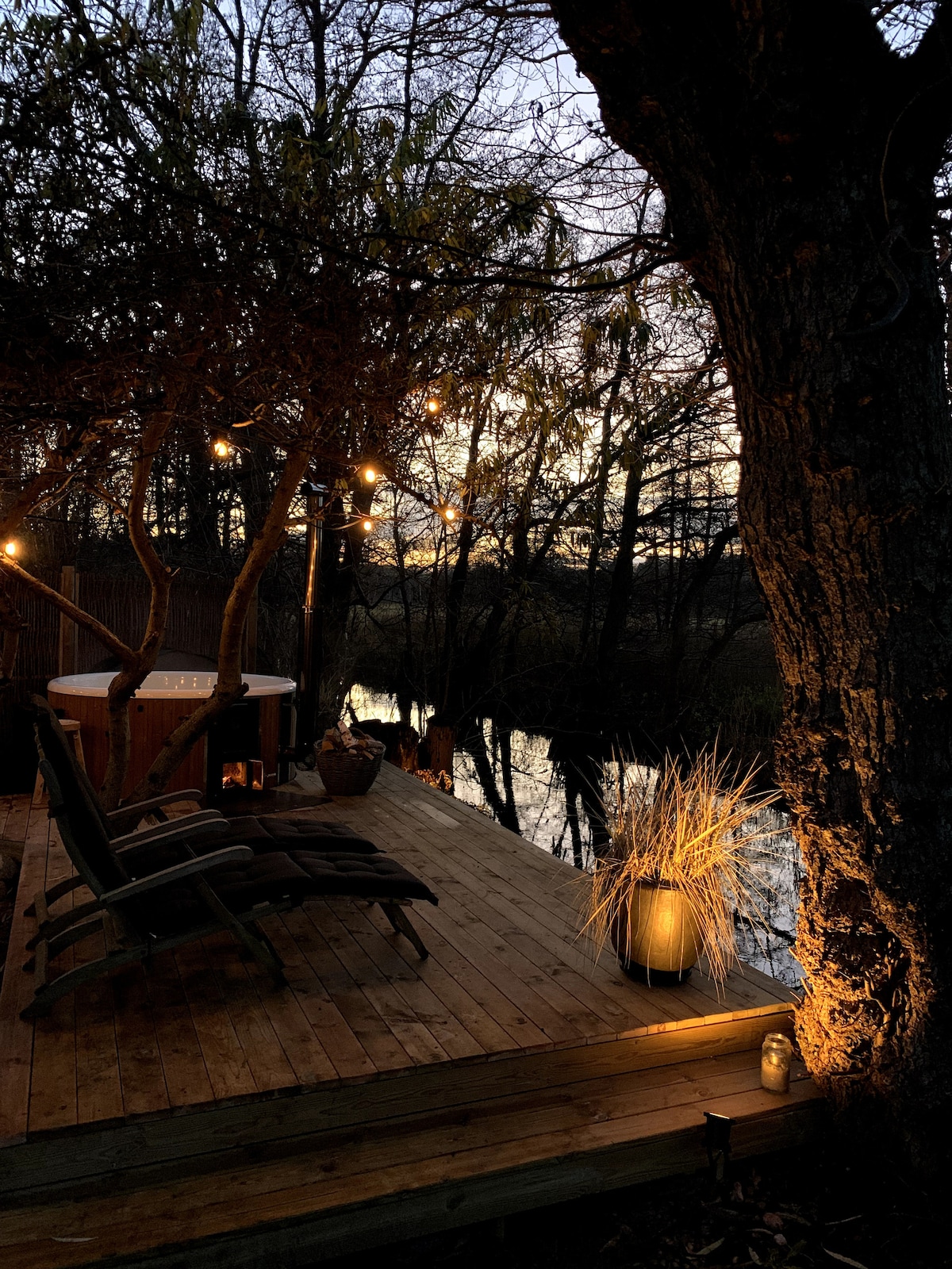 आमच्या आरामदायक ट्रीहाऊसमध्ये तुमचे स्वागत आहे, जे रिसायकल केलेल्या सामग्रीपासून बनवले गेले आहे - जमिनीपासून 6.2 मीटर उंचीवर. कॉटेजच्या बाहेर शेते दिसतात, ते इन्सुलेटेड आहे, त्यात वीज, हीटिंग, चहा बनवण्यासाठी किचन आणि एक आरामदायक सोफा आहे जो एका लहान डबल बेडमध्ये रूपांतरित होतो. कॉटेजच्या वरच्या भागात दोन टेरेस आणि वाहते पाणी आणि खाली सिंकसह टॉयलेटचा आनंद घ्या. खरेदी करण्याचा पर्याय: नाश्ता (175 kr/2 व्यक्ती) - विल्डरनेस बाथ (350 kr) किंवा आमच्या 2 आउटडोर 'एस्केप रूम्स' पैकी एक (150 kr/मुले, 200 kr/प्रौढ). कॅलेंडर सतत उघडेल!