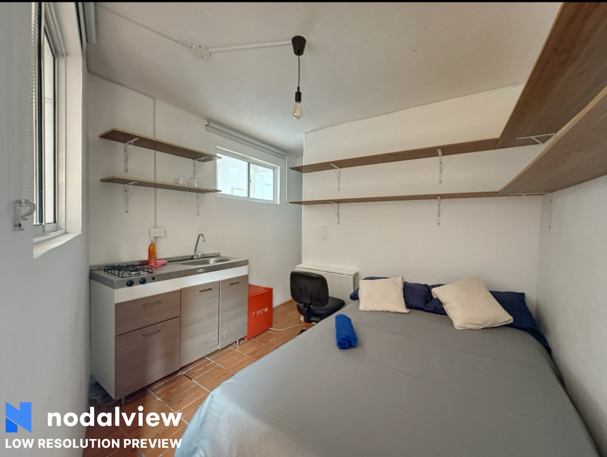 Our comfortable one bedroom apart-studio, interior location with windows towards a garage, and to a courtyard, bohemian, minimalist, with a small garden has a true city feeling! It comfortably accommodates four people and it´s centrally located on a street, with easy access to Simon Bolivar Metropolitan Park. Enjoy a complete kitchen, and access to Transmilenio. This space is ideal for two people; however, we provide a high quality sofa bed for two more people should the need arise. Hot water