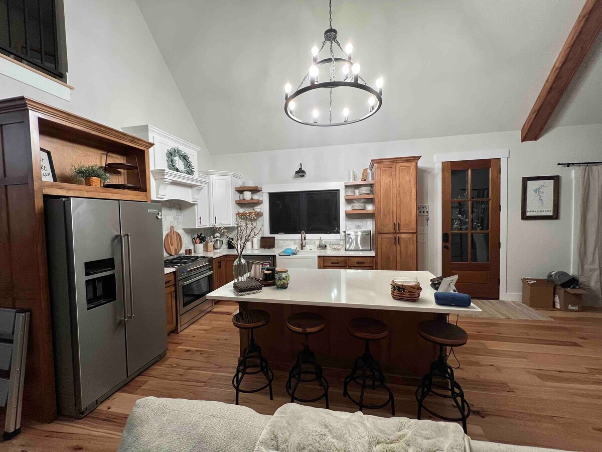 छोटे गेस्टचे घर सुंदरपणे सजवलेले आणि अत्यंत आरामदायक आहे. आम्ही चॉकलेट, पाण्याच्या 2 बाटल्या, कॉफी पॉड्स, उच्च गुणवत्तेचे लिनन्स आणि जाड मॅट्रेस टॉपर्ससह स्नॅक्स प्रदान करतो. शांत परिसर, किचनमध्ये वाई/ रेफ्रिजरेटर, मायक्रोवेव्ह, हॉट प्लेट, कॉफी बार आणि 55"टेलिव्हिजन सुसज्ज आहे. बोट हुकअपसाठी बाहेरील आऊटलेट. प्रशस्त पार्किंग. मॅमोथ गुहापर्यंत 20 मिनिटांच्या अंतरावर, बॅरेन रिव्हर धरण आणि डॉकपासून 4 मैलांच्या अंतरावर. युनिट मुख्य घराच्या जवळ आहे, म्हणून जर तुम्ही काही विसरलात, तर आम्ही तुम्हाला कव्हर केले आहे.