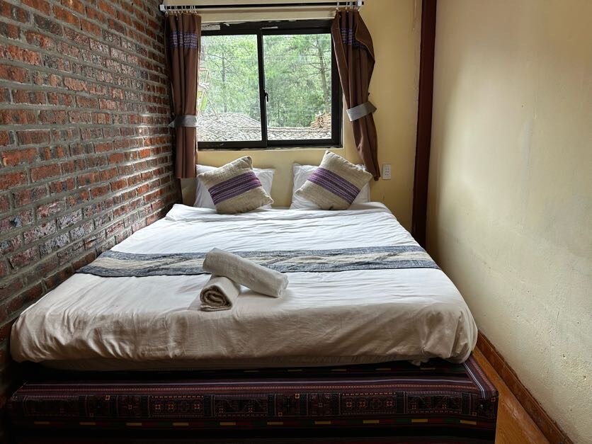 Spacious 26m² deluxe room with a 1.8m king bed, ensuite bathroom, and AC heating and cooling for all-season comfort. Large windows open to a beautiful mountain view, creating a quiet and relaxing retreat. Just 50m from the local Hmong market and surrounded by untouched villages, trekking paths, biking routes, and bamboo rafting. A stay at Ha Giang Aya Lodge offers rare quiet, deep cultural connection, and one of the best settings in Dong Van and Meo Vac.