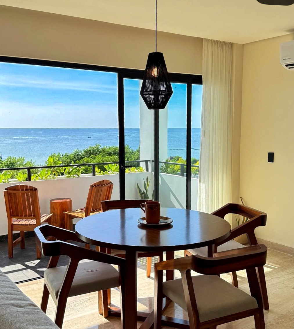 Departamento ubicado en primera linea frente al mar, a pie de playa, sobre el Malecon pero alejado del ruido del centro, privado, internet starlink y con todas las comodidades necesarias. Diez minutos caminando al centro. Estacionamiento privado dentro de la propiedad