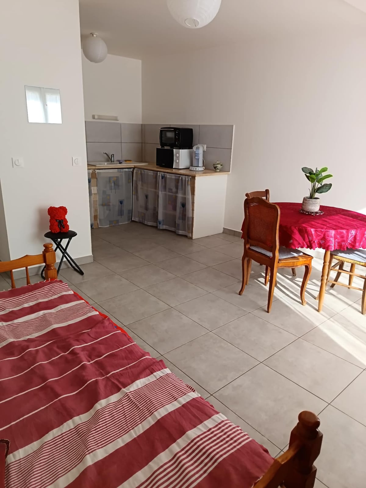 तळमजला घर, तात्काळ पार्किंग, एका व्यक्तीसाठी सोफा बेड आणि 1 सीटर आर्मचेअर असलेली मोठी लिव्हिंग रूम. नवीन किचन, वायफाय ऑफिसची जागा आणि सुंदर बाथरूम (शॉवर) उबदार वातावरण. सर्व सुविधा, बस स्थानक आणि SNCF जवळ. सिटी हॉल आणि पर्यटक कार्यालयाजवळील तात्काळ बस स्टॉप, कोणासाठीही योग्य नाही. शांत आसपासचा परिसर. धूम्रपान करू नका.