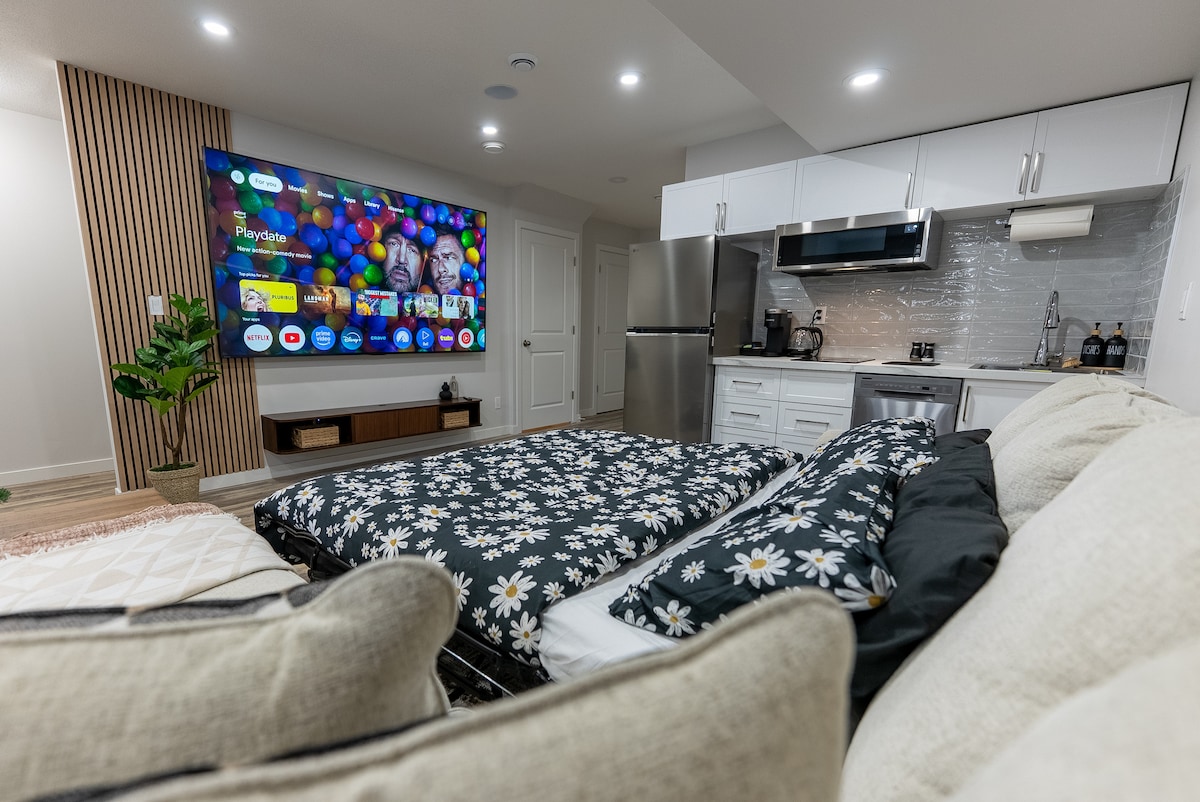 सेंट्रल अल्बर्टाच्या मध्यभागी QE2 च्या अगदी जवळ असलेल्या आमच्या स्टाईलिश आणि पूर्णपणे खाजगी सुईटमध्ये परत या आणि आराम करा. आमचे नव्याने विकसित केलेले Airbnb 2 -4 गेस्ट्सना सामावून घेण्यासाठी प्रेम आणि काळजीने तयार केले गेले होते. ही जागा डायनिंग एरिया, QB असलेली लक्झरी बेडरूम, उबदार फायरप्लेस/टीव्ही/ आणि पुलआऊट QB असलेली लिव्हिंग रूमसह पूर्ण किचन देते. स्थानिक आकर्षणांपासून काही मिनिटांच्या अंतरावर सोयीस्करपणे स्थित स्वतःहून चेक इन / खाजगी पार्किंग
